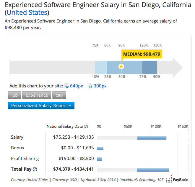 Alex Salkever did us HR professionals a major solid by addressing three pertinent conditions for his review of coder compensation: fluency in a specific coding language, level of coder (aka years in the game + responsibility/leadership), and salary by location. I did a quick search to see what Python Software Engineers make in San Diego and the data wasn’t all that surprising to me. In fact, as I suspected, our company pays on the high end of the compensation range compared to other software companies in San Diego, which I see as a strong compensation philosophy for a small and very competitive market. I did a quick review of entry level vs. mid-career vs. senior career level pay for San Diego, and here is the data comparison: